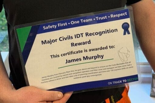 At Flannery Plant Hire, we take pride in the dedication and hard work of our team, and today we are excited to highlight the incredible contributions of one of our standout employees, James Murphy. Recently, James received the prestigious Major Civil IDT Recognition Award for his outstanding work on the Transpennine Route Upgrade (TRU) project—a recognition that is thoroughly well-deserved!